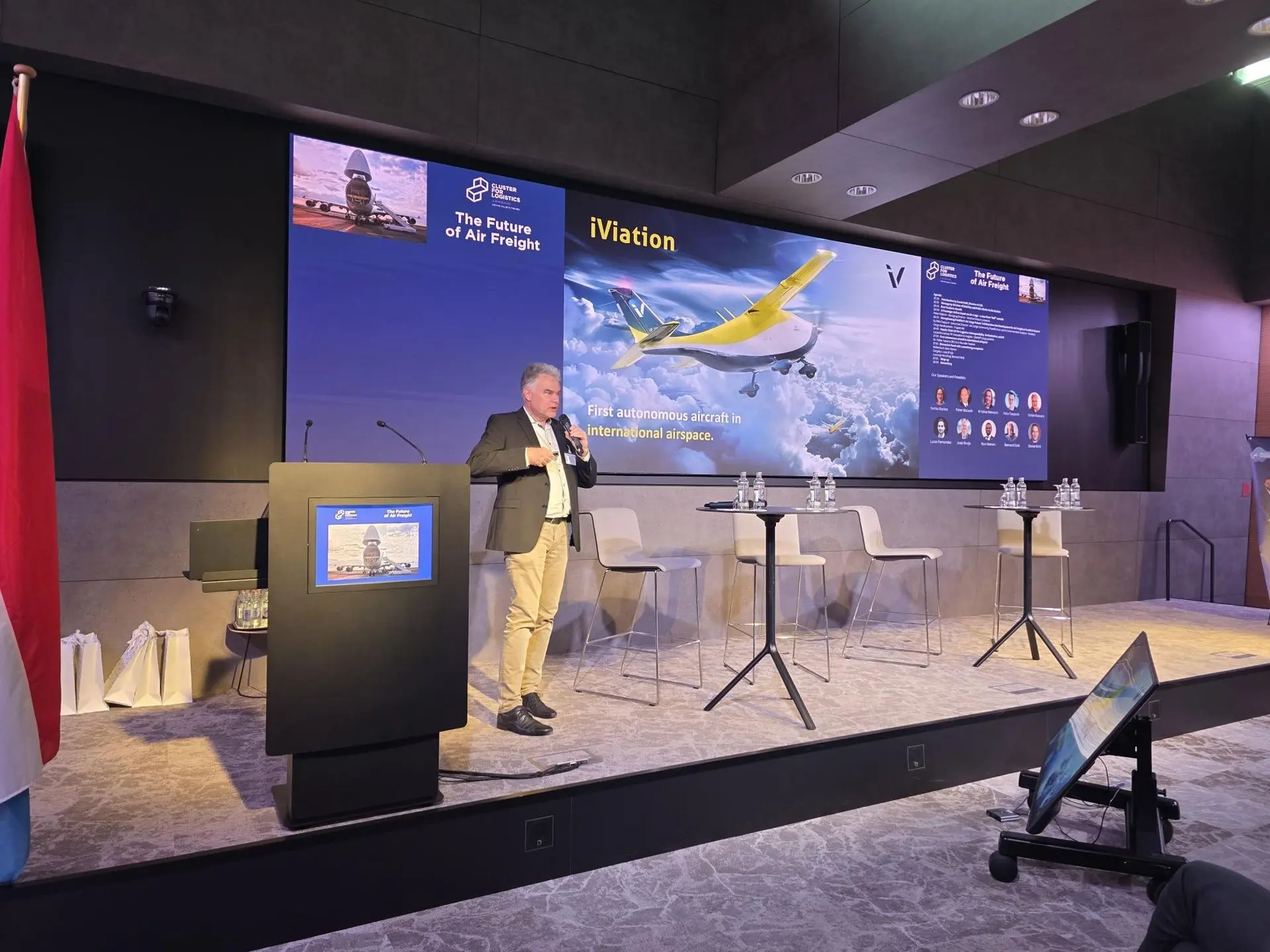 Dr. Volker Kassera, CEO and co-founder of iViation, presented the first autonomous aircraft operating in international airspace. The aircraft, capable of transporting three Euro-pallets, offers a 38% speed advantage compared to road transport and a 65% cost advantage in operating costs.